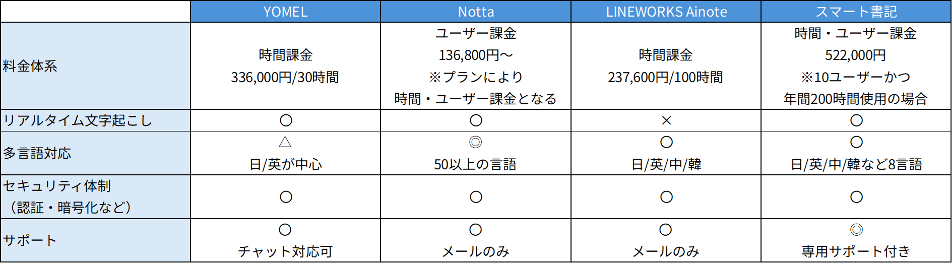三谷商事で取り扱いのある4つのAI議事録ツールについて、5つの差別化ポイント(料金体系、リアルタイム文字起こし、多言語対応、セキュリティ体制、サポート)に分けて比較しました。