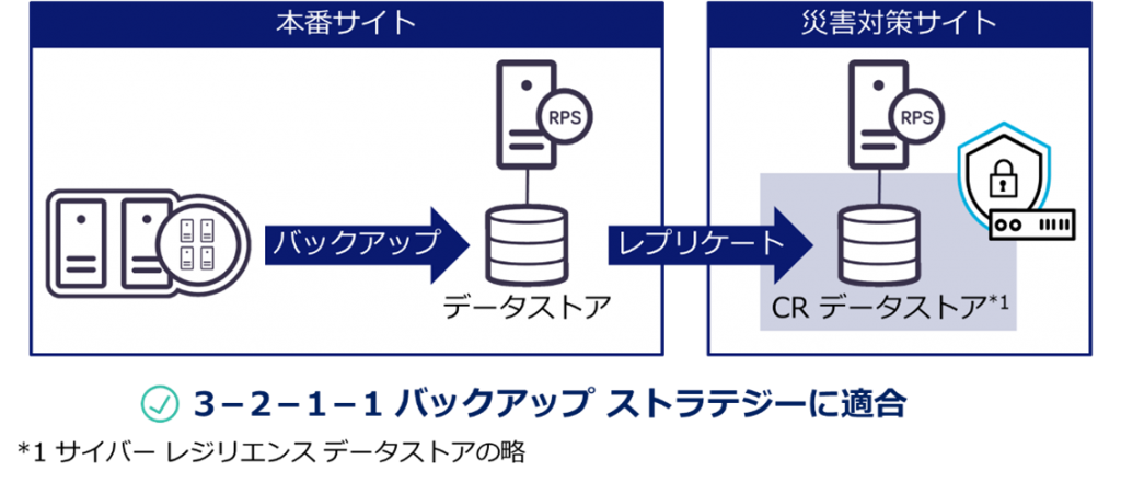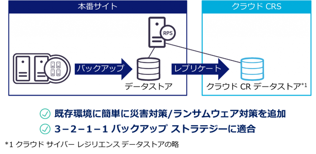 クラウドCRSとCRSのいずれも、一次バックアップ先としても二次以降のバックアップ先としても利用可能です。お勧めは3-2-1-1バックアップストラテジーに適合させることができる二次バックアップとしての利用です。
